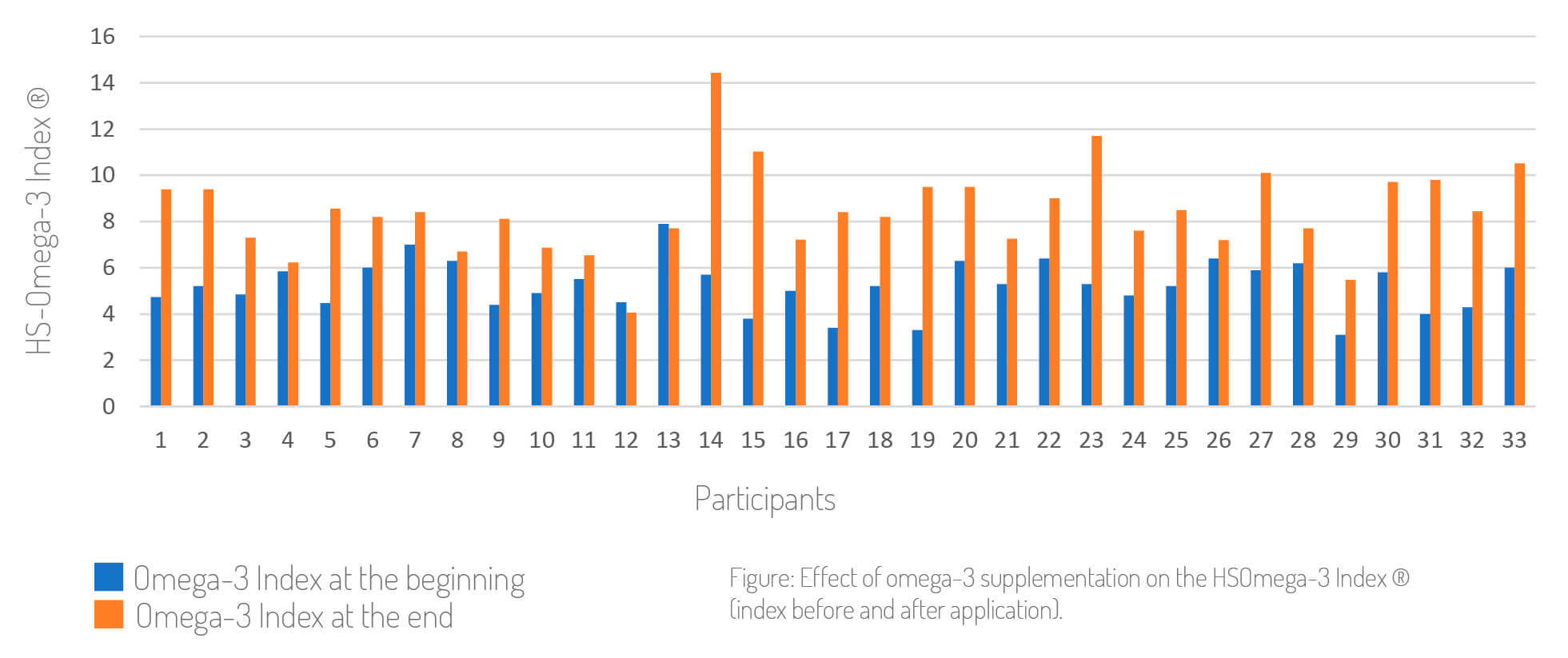 On average, the Omega-3 Index® increased by 61 % from a baseline value of 5.2 % to an Omega-3 Index® of 8.4 %. In 20 of 33 participants, the HS-Omega-3-Index® was in the optimal range of ≥8 % after the end of the study. Only in 6 patients no or only a slight increase of the HS-Omega-3-Index® could be detected. The reason for this could possibly be the intake on an empty stomach or inconsistent intake during the application period.