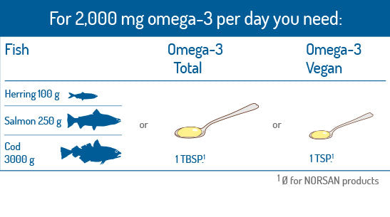 Regular consumption of quality omega-3 food supplements based on fish oil or seaweed oil, carefully purified and free of harmful substances, is therefore an excellent alternative. With NORSAN Omega-3 oils, for example, one spoonful per day is sufficient to cover the Omega-3 requirement of 2,000 mg.